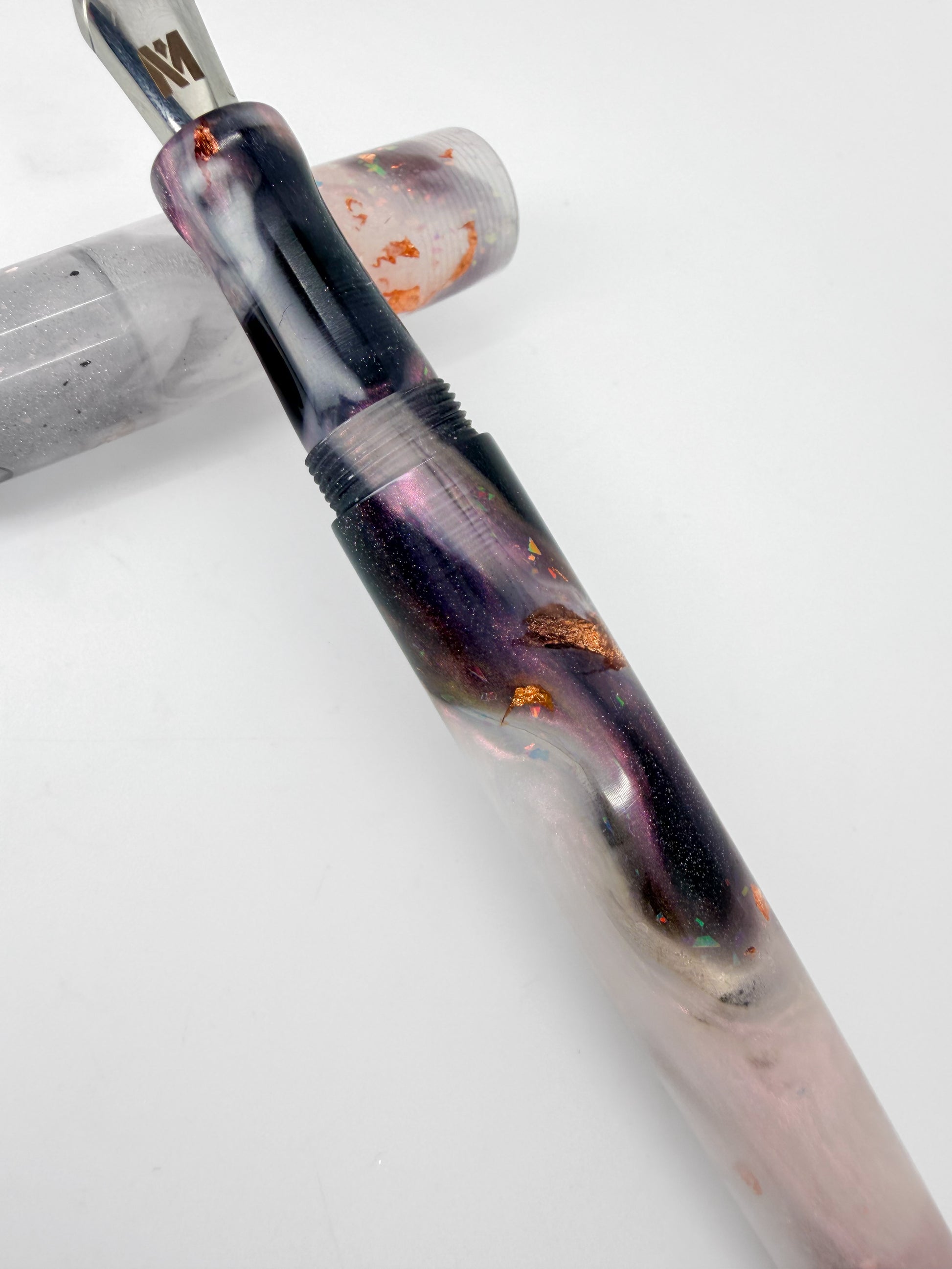 It was created from our custom in house Alumilite resin blanks and turned on my lathe. The cap and body have triple start threads. The section is threaded for JoWo #6 nibs.