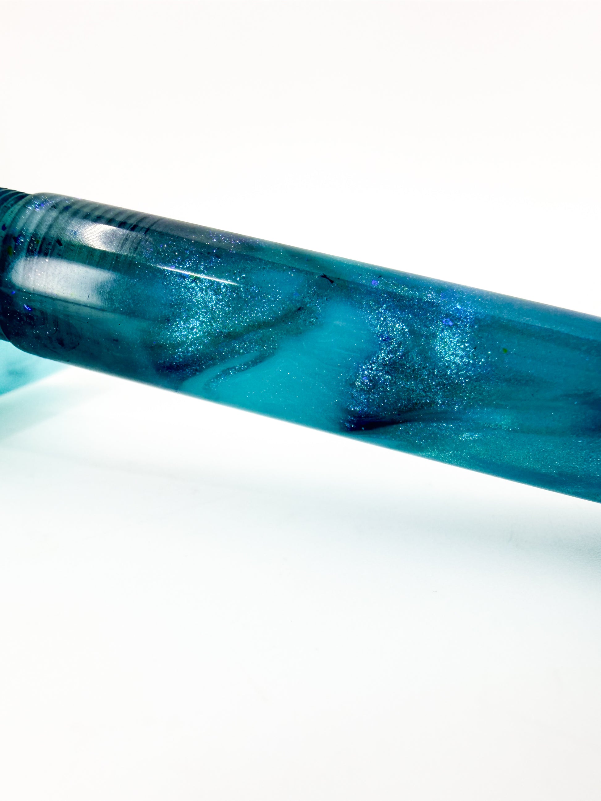 It was created from our custom in house Alumilite resin blanks and turned on my lathe. The cap and body have triple start threads. The section is threaded for JoWo #6 nibs.
