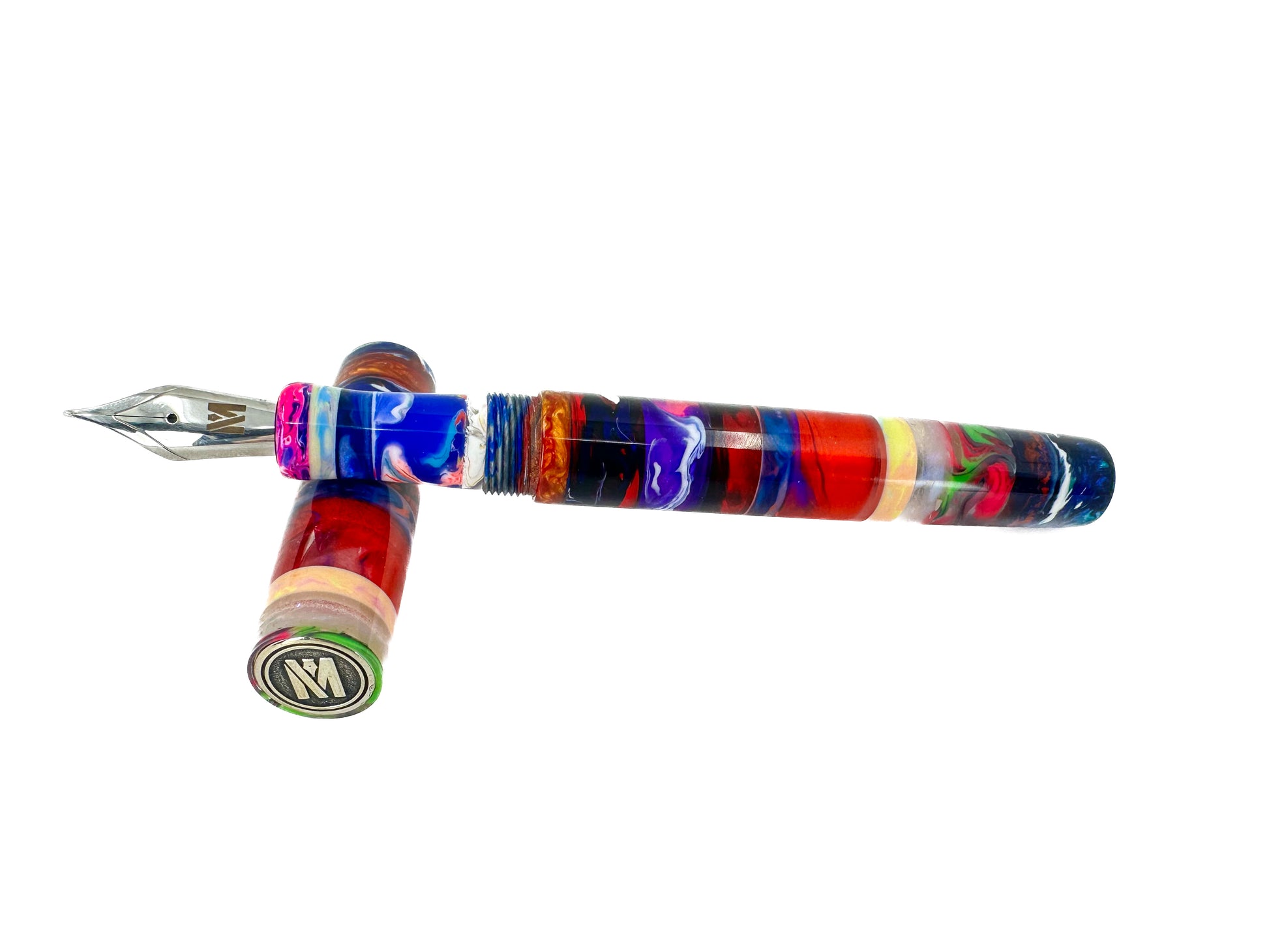 It was created from our custom in house Alumilite resin blanks and turned on my lathe. The cap and body have triple start threads. The section is threaded for JoWo #6 nibs.